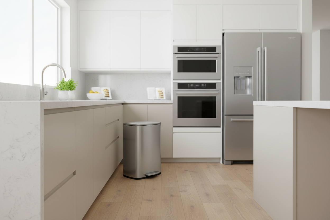 A large-capacity stainless steel trash can designed for everyday kitchen and home use. Features a quiet soft-close lid and hands-free foot pedal for clean, convenient disposal. The removable inner bucket allows easy liner changes, while the tight-fitting lid helps control odors. Sleek, modern design fits kitchens, offices, and living spaces.