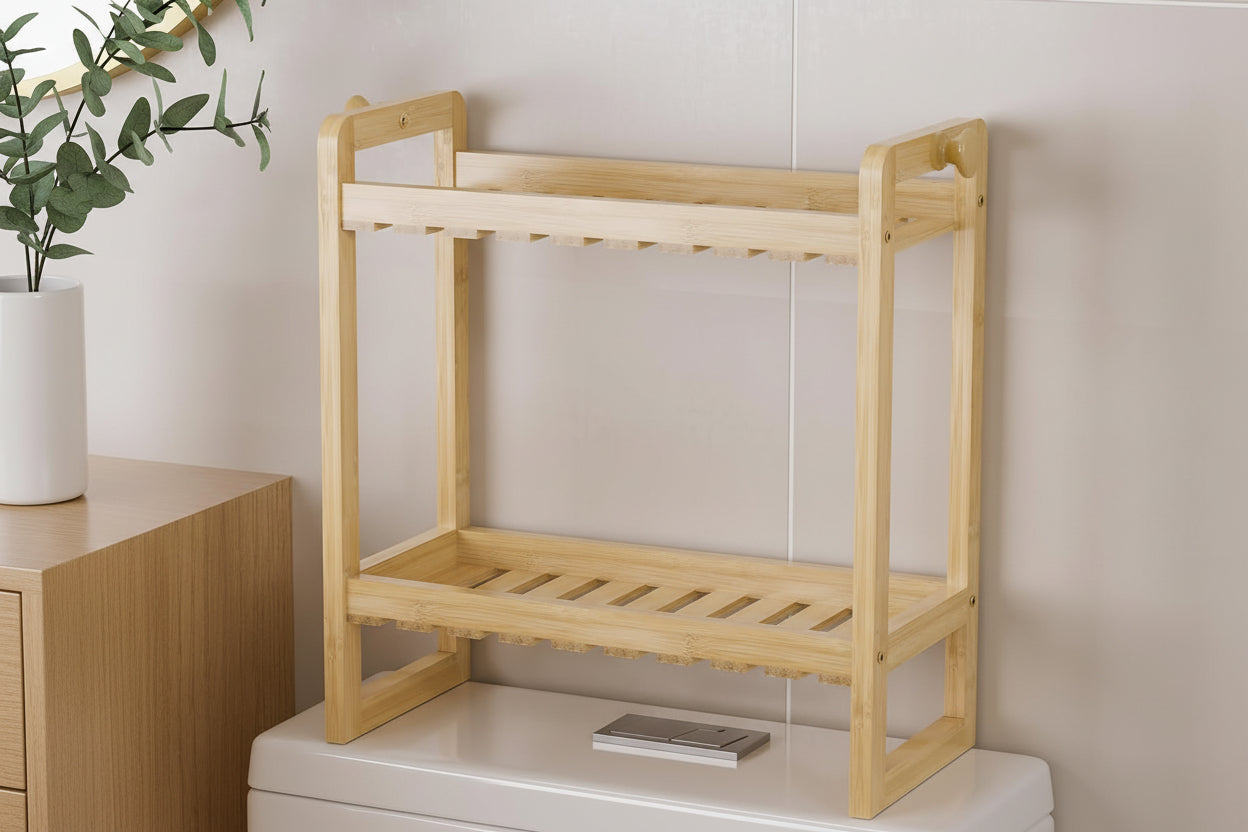 A compact bamboo storage shelf designed to sit securely over the toilet tank or countertop. The slim profile helps organize daily bathroom essentials without taking up extra space. Natural bamboo adds warmth while keeping the setup clean, simple, and functional for small bathrooms.