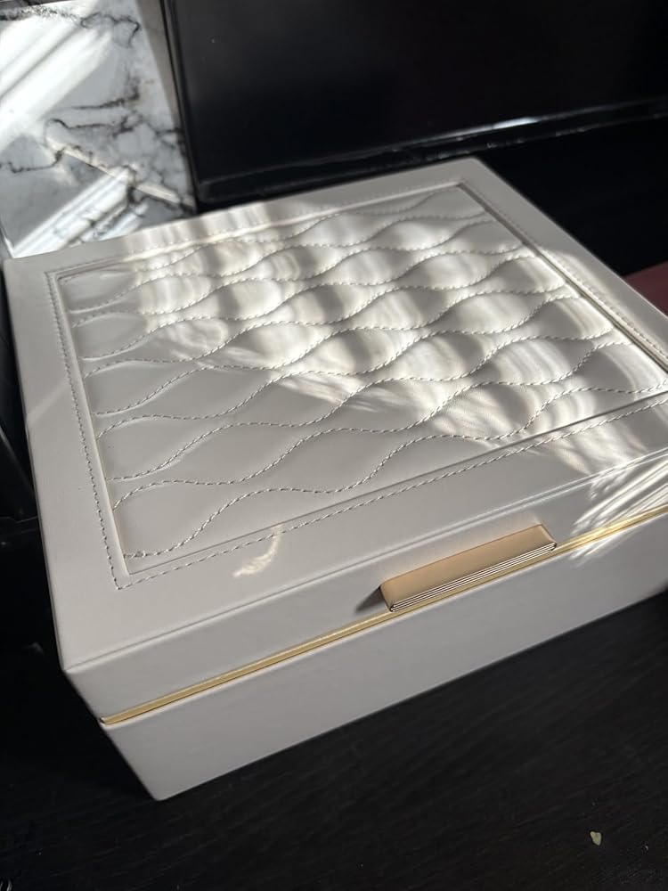 Two-layer jewelry organizer designed for structured storage of everyday accessories. The compact case keeps necklaces, rings, earrings, bracelets, and larger items separated and easy to access, while maintaining a clean, elegant appearance on a dresser or vanity.