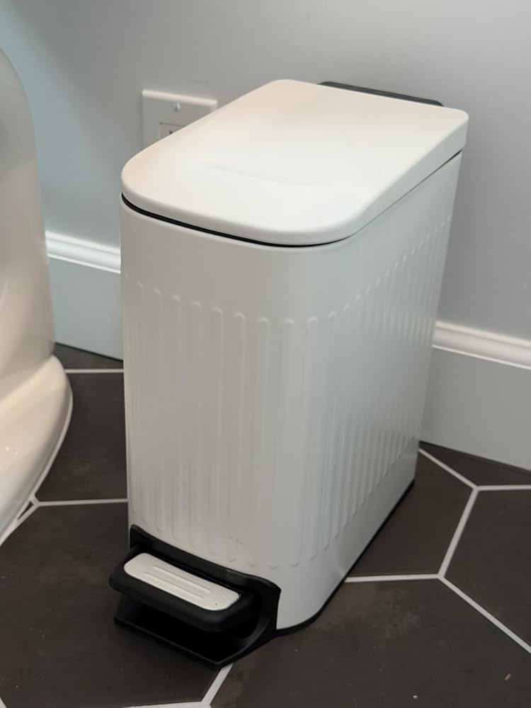 A compact, space-saving trash can designed for bathrooms, bedrooms, and tight spaces. Features a quiet soft-close lid, hands-free step pedal, and removable inner bucket for easy daily use.